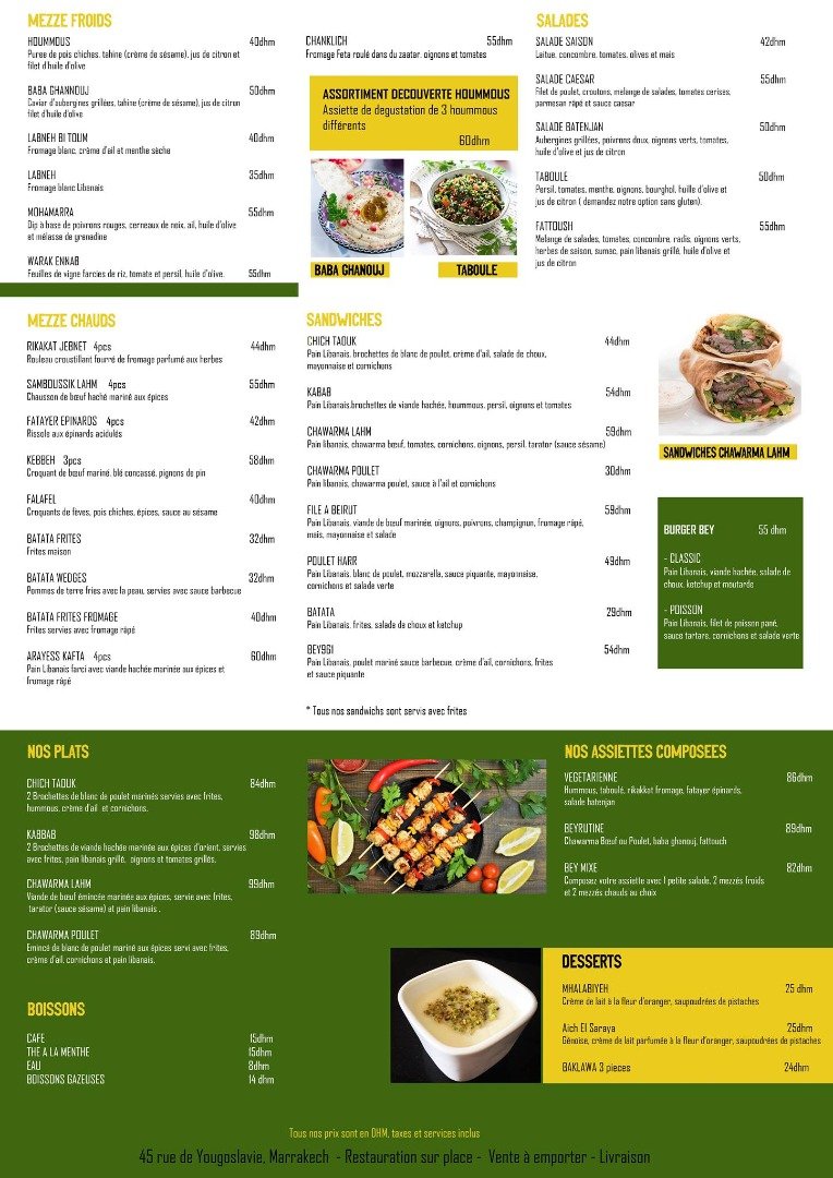 De plus, l’ambiance élégante et décontractée de notre établissement en fait un lieu idéal pour célébrer des occasions spéciales, des anniversaires aux réunions d’affaires. En somme, que vous soyez un habitant de Marrakech ou un visiteur de passage, BEY 961 vous invite à vivre une expérience gastronomique inoubliable au cœur de la ville. Rejoignez-nous pour un voyage culinaire qui éveillera vos sens et laissera une empreinte durable dans votre mémoire. »