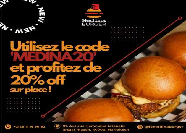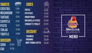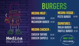 « Medina Burger, un sanctuaire pour les amateurs de burgers au cœur de Marrakech, incarne l’essence de la gastronomie urbaine avec une touche méditerranéenne. Notre établissement va au-delà du simple burger, c’est une expérience où les saveurs locales et les classiques du fast-food fusionnent pour créer une aventure gustative unique.
